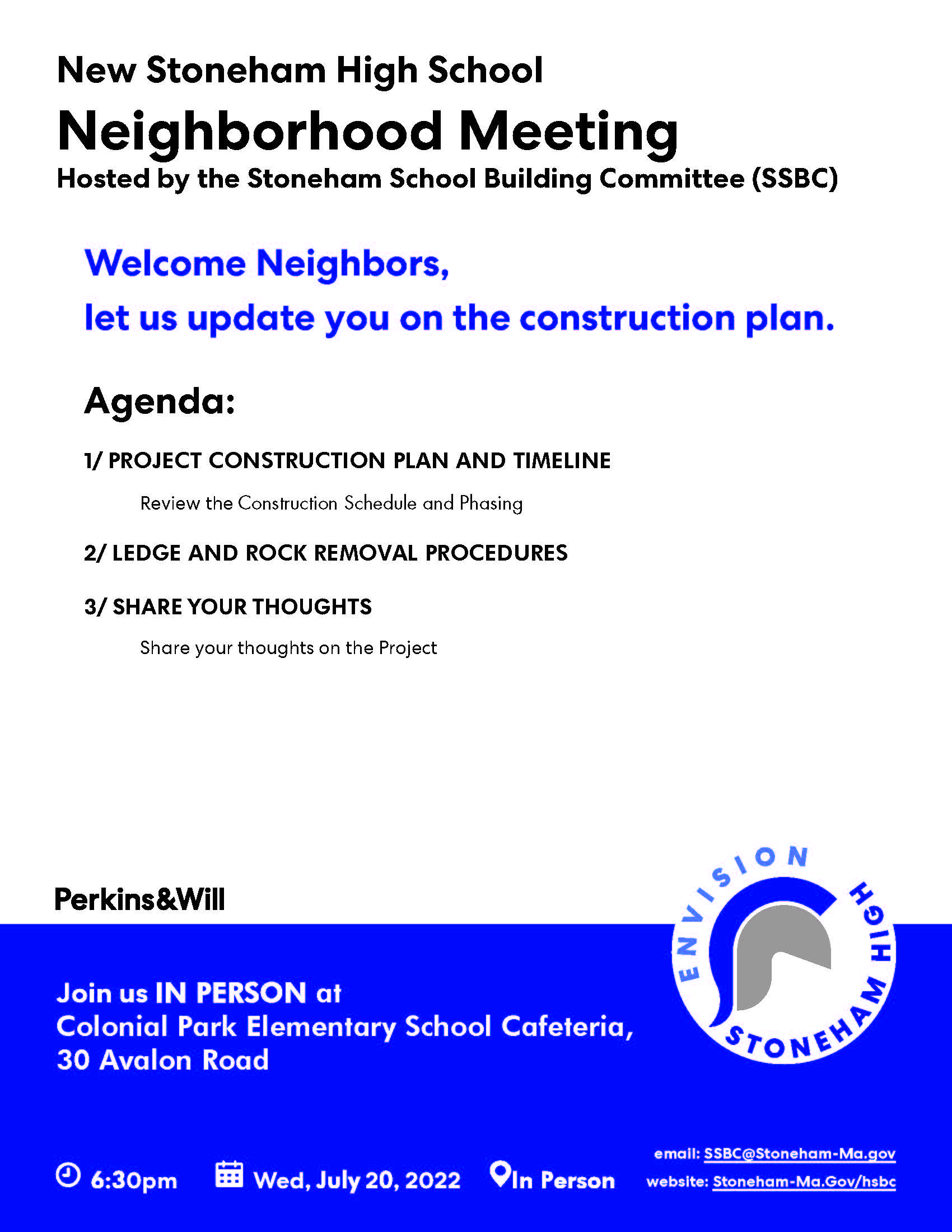 The Stoneham School Building Committee (SSBC) invited residents and community stakeholders to an interactive online presentation to update you on the planning of the Stoneham High School Project. The SSBC is in the feasibility phase of the process, and we are looking for community input.